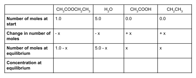 Let’s start by writing out the values that we do know in a table. We know that at the start, we have 1 mole of ethyl ethanoate and 5 moles of water. To form an equilibrium, some of the ethyl ethanoate and water will react to form ethanol and ethanoic acid.