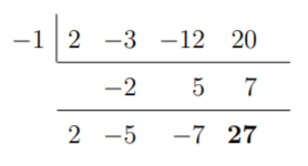 Here, we see that –1 gives a remainder of 27. Thus, it is not a root of the quotient. In other words, there are no multiplicities of the root –1. Let us now try +2.