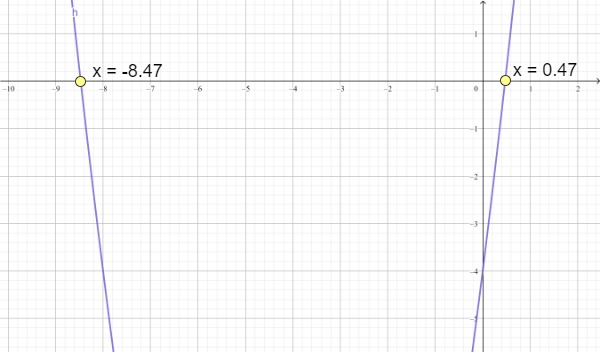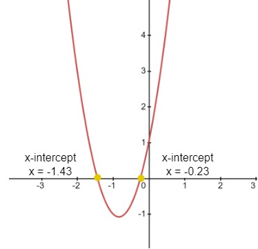 By the Location Principle, notice that the x-intercepts of the graph suggest that one solution is between –6 and –5, and the other is between 0 and 1.