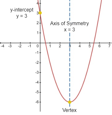 1. To find the y-intercept we shall evaluate f at x = 0. In doing so we obtain, f(0) = c = 3. Thus the y-intercept is (0, 3). The equation of the axis of symmetry is found by using the formula