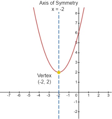 Since h = –2 and k = 2, the vertex is at (–2, 2). The axis of symmetry is x = –2. Since a = 1, the graph opens up and has the same shape as the graph of y = x2. Furthermore, the graph is translated 2 units left and 2 units up.