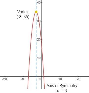 The vertex is at (–3, 35), and the axis of symmetry is x = –3. Since a = –2, the graph opens downward and is narrower than the graph of y = x2. Additionally, the graph is translated 1 unit right and 2 units up.